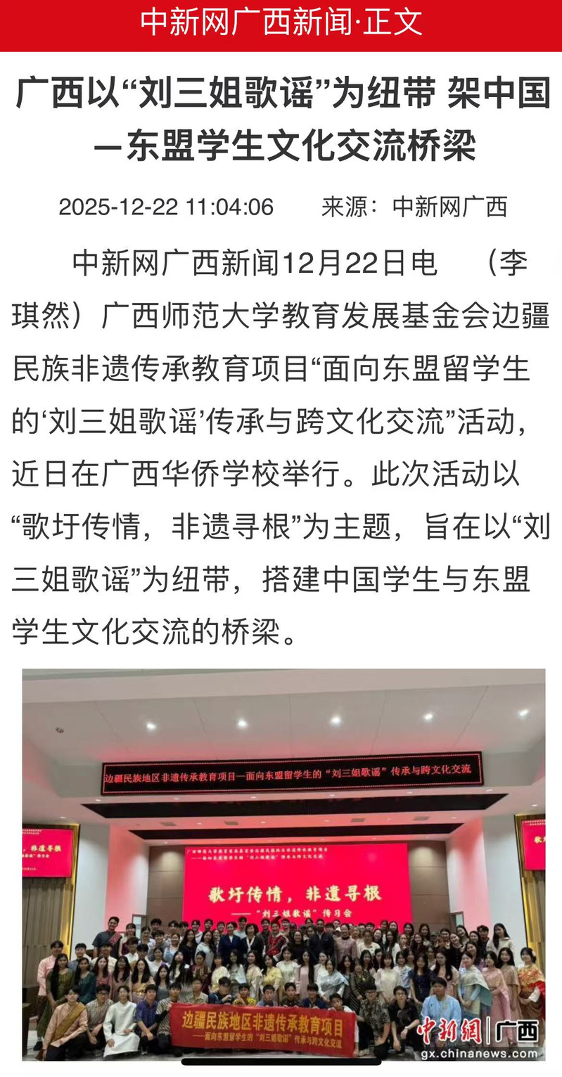 12月22日,【中新网】关注报道了基金会支持的“面向东盟留学生的‘刘三姐歌谣’传承与跨文化交流”项目活动。作为“边疆民族非遗传承教育项目”的重要组成部分,该活动充分发挥广西民族文化的独特优势,以“刘三姐歌谣”为纽带,搭建了中国与东盟青年之间的文化理解与情感沟通桥梁,为服务国家“一带一路”人文交流、推动构建中国—东盟命运共同体贡献力量。