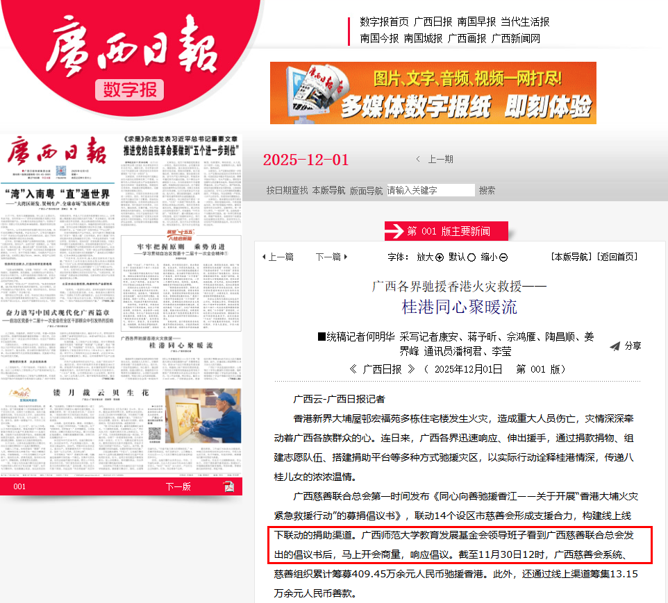 《广西日报》关注报道我校教育发展基金会迅速响应“香港大埔火灾紧急救援行动”募捐倡议